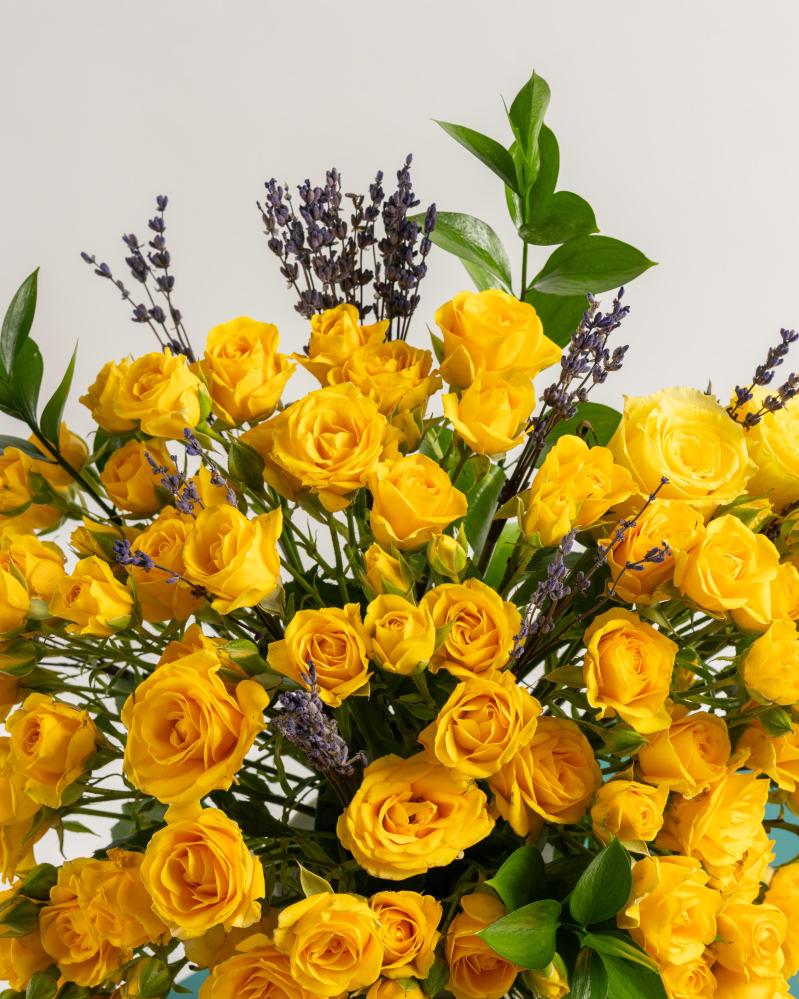 دع البهجة تدخل المكان مع باقة إشراقة الشمس، تنسيق فاخر ينبض بالحيوية والدفء. تتكوّن هذه الباقة من عدد كبير من زهور الجوري الصفراء الفاخرة، المتناثرة بشكل فني جذاب مع لمسات خضراء من اللافندر الطبيعي، في تصميم مفعم بالإشراق.